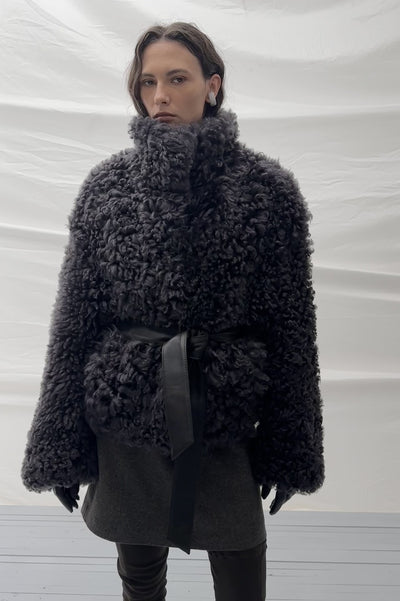 A coat by Kulakovsky crafted from tigrado shearling, known for its distinctive texture. The soft waves of the tigrado create a fluid silhouette and add natural volume.