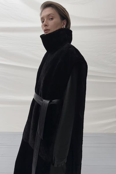 A dickey by Kulakovsky crafted from astrakhan shearling – an elongated, midi-length model with a stand collar and a continuous vertical silhouette.