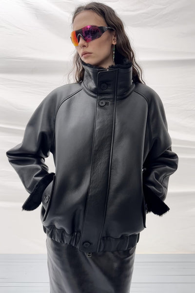 Дублянка Arden від Kulakovsky з чорної овчини мерино – з м’якою лінією плеча, яку формує рукав-реглан. Плавний перехід у плечовій зоні підтримує вільний крій і комфортну посадку.